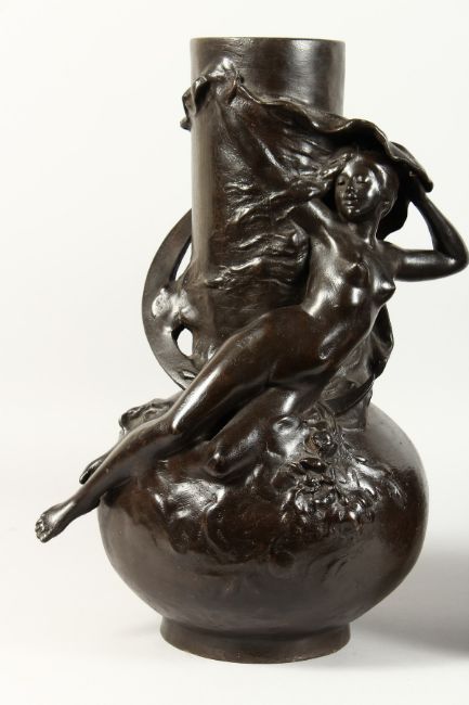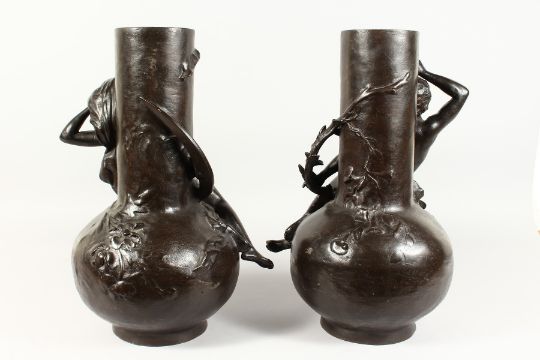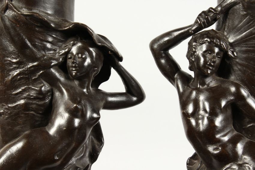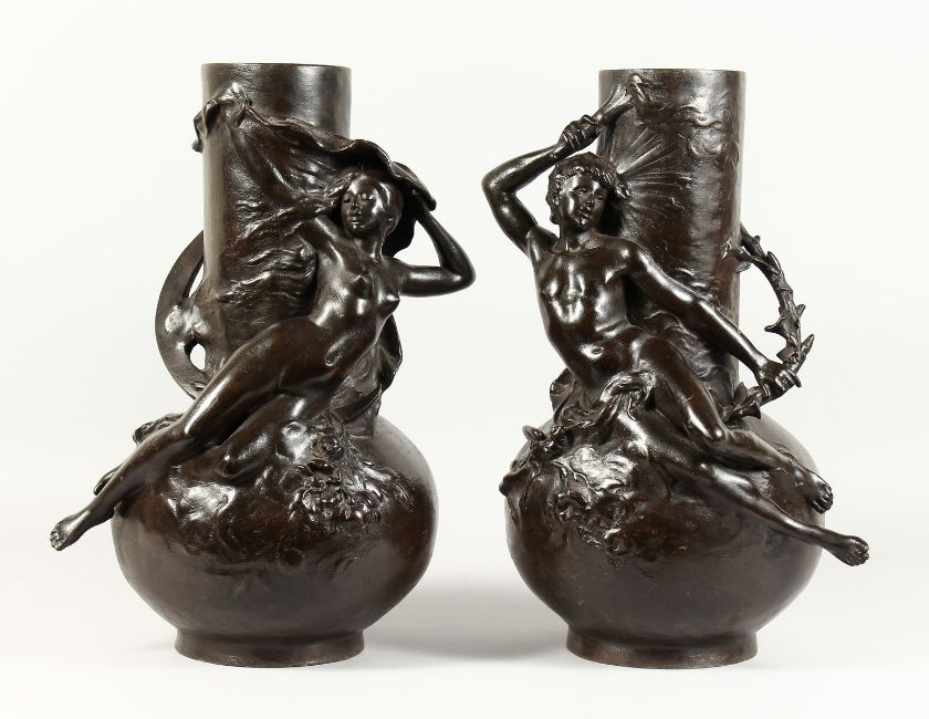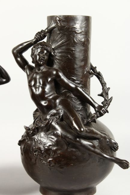 A SUPERB LARGE PAIR OF BRONZE BULBOUS VASES with two reclining nudes and male figures as handles.