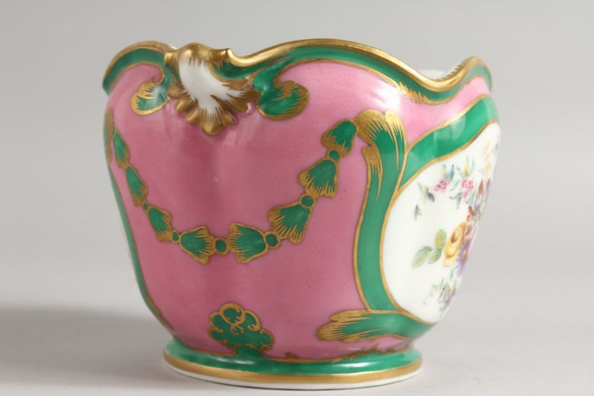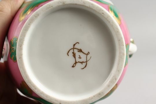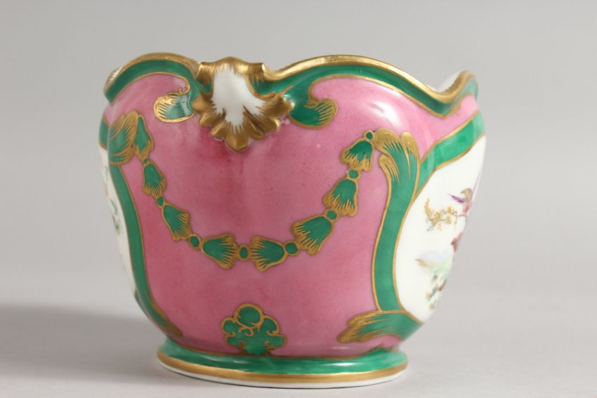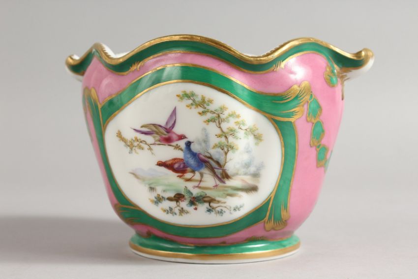 A SUPERB PARIS PORCELAIN CACHE POT painted with birds in a landscape under a pink and dark green ground, mid 19th Century.