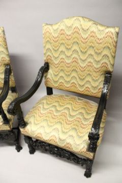 A MATCHED PAIR OF CARVED AND EBONISED JACOBEAN REVIVAL ARMCHAIRS, with upholstered backs and seats.