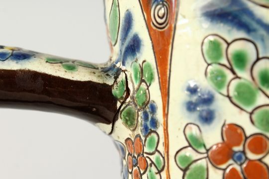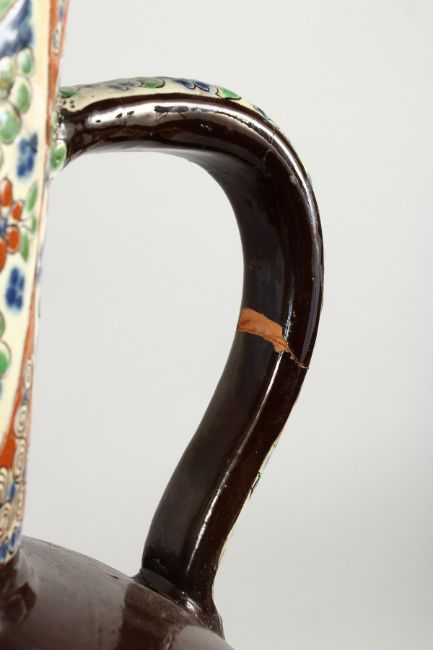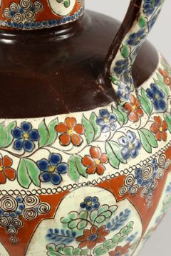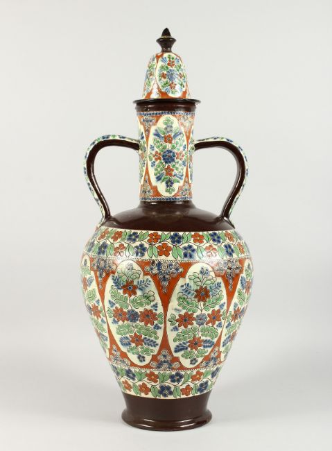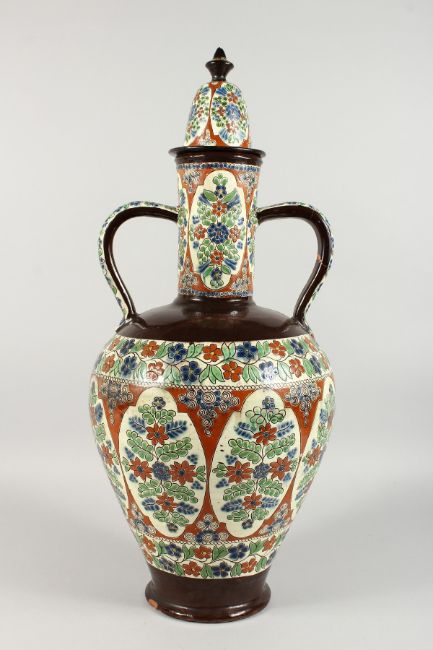 A LARGE TURKISH POTTERY TWO-HANDLED VASE AND COVER.
