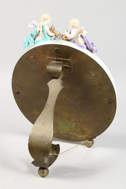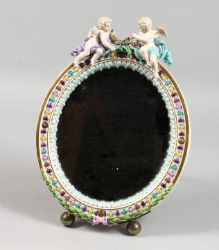A GOOD 19TH CENTURY MEISSEN OVAL MIRROR with cupid holding a garland.