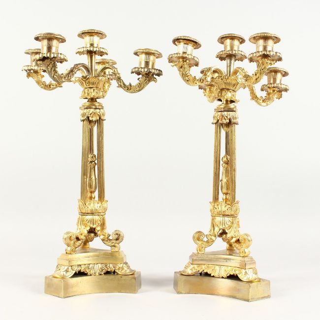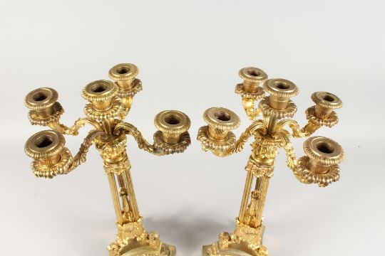 A GOOD PAIR OF LATE 19TH CENTURY GILT BRONZE CANDELABRA, with central candle holder, four scrolling branches, on cluster columns, with scroll feet and concave sided platform bases.