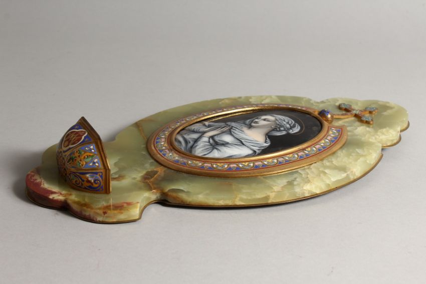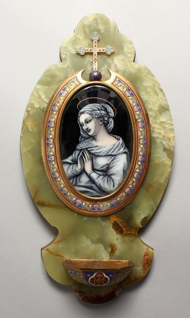 A GOOD LATE 19TH CENTURY ONYX AND CHAMPLEVE ENAMEL HOLY WATER FONT, mounted with an oval enamel plaque of a woman at prayer.