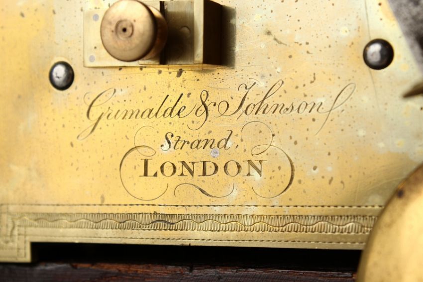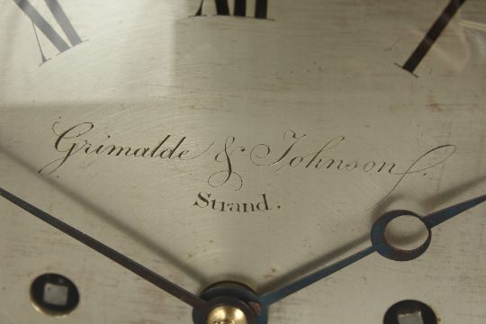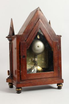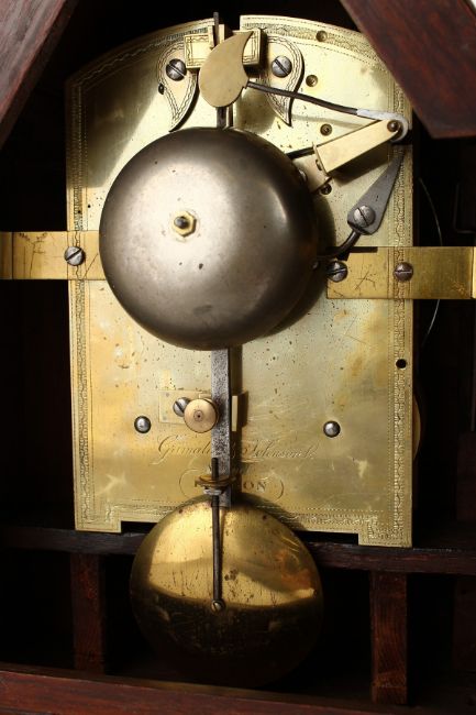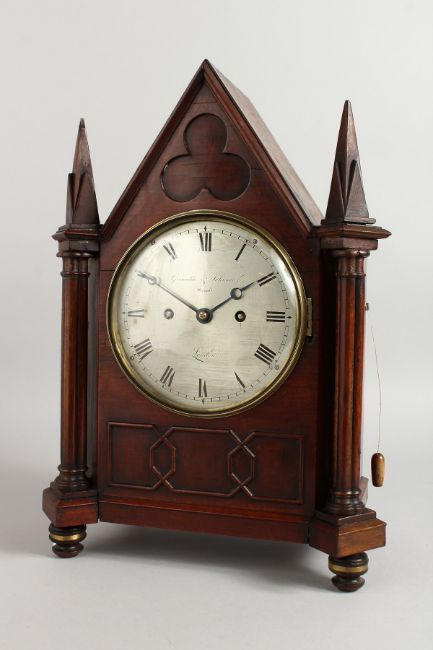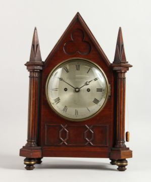 A 19TH CENTURY MAHOGANY MANTLE CLOCK, with eight day movement, the circular silvered dial signed Grimaldi & Johnson, Strand, London, in an architectural case.