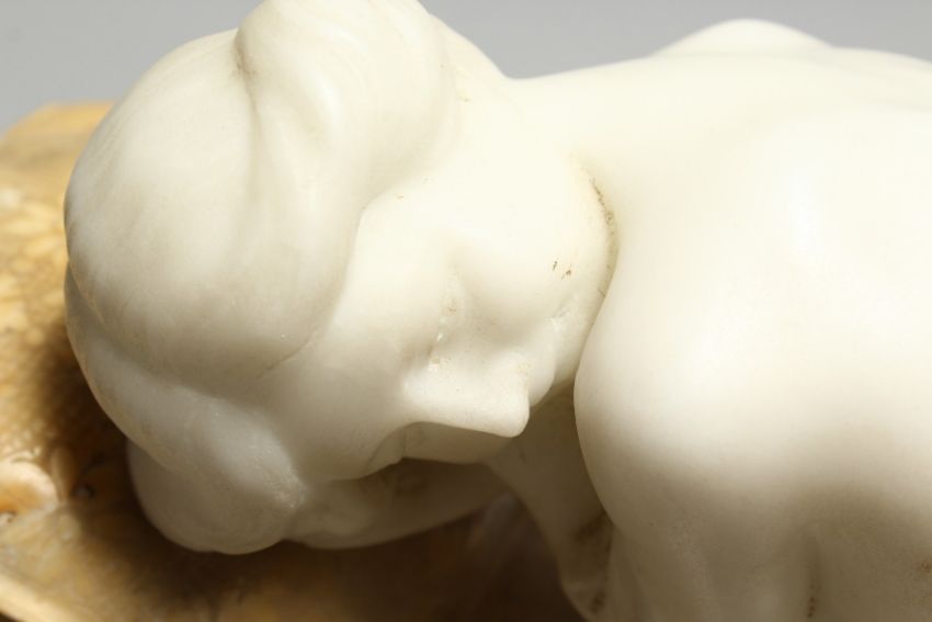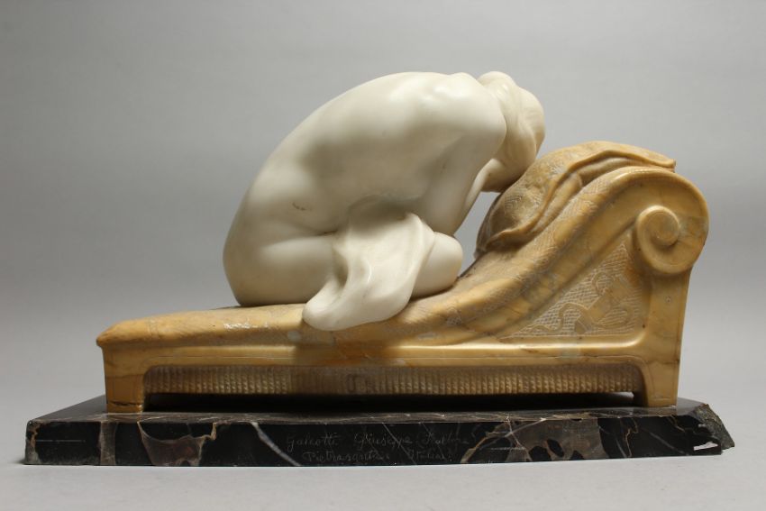 A GOOD LATE 19TH CENTURY CARVED WHITE MARBLE RECLINING FEMALE NUDE, mounted on a yellow marble day bed with variegated black marble base.