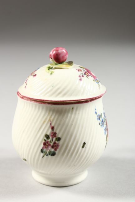 A MID 18TH CENTURY MENNECY CUSTARD CUP AND COVER or pot a jus, spirally moulded and painted with flowers.