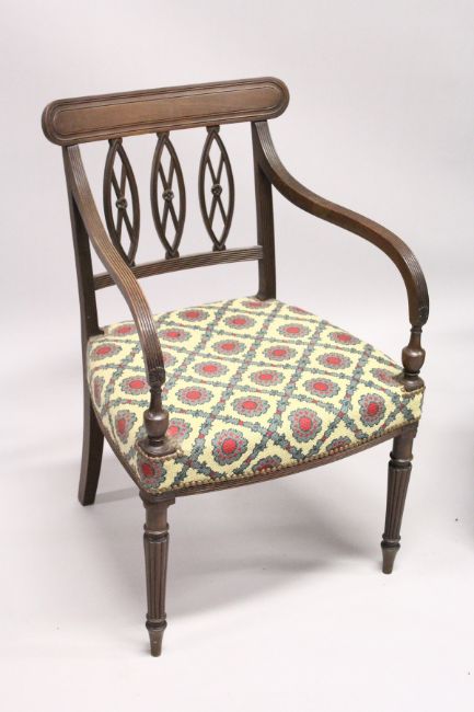 A GOOD PAIR OF REGENCY MAHOGANY ARMCHAIRS, with triple pierced oval splats, reeded arms, padded seats and fluted legs.