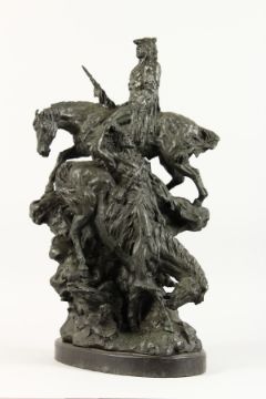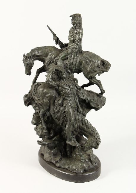 A LARGE BRONZE GROUP, RED INDIANS ON HORSEBACK, on an oval marble base.