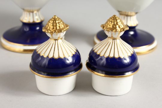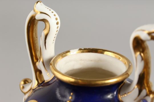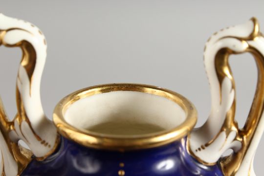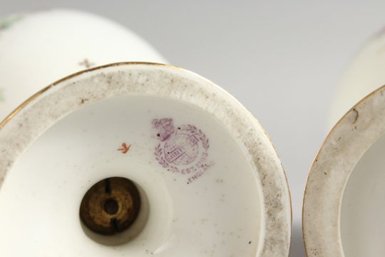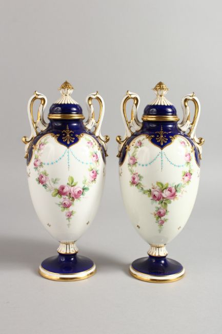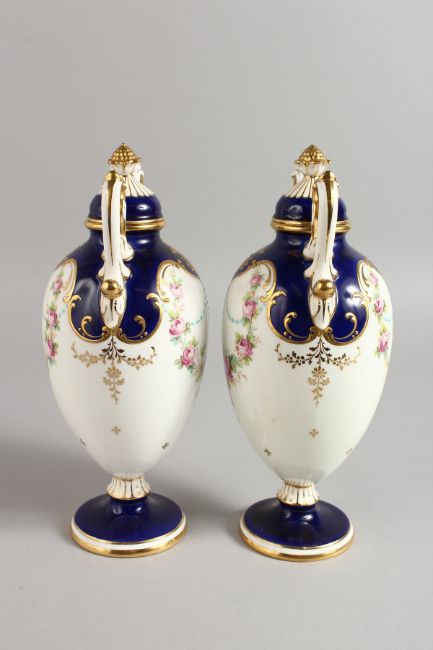 AN EARLY 20TH CENTURY MINTON PAIR OF TWO-HANDLED PEDESTAL OVOID VASES painted by Dudley, signed, with rose swags and tendrils, jewelled with turquoise seed pearls, domed fluted covers, bud finials and leafy scroll handles.