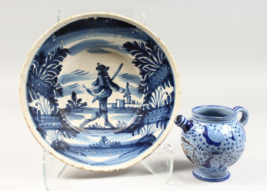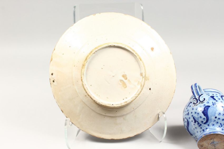 A 19TH CENTURY CONTINENTAL TINGLAZE CIRCULAR DISH, painted with a figure in a landscape, and a small pottery drug jar (2).