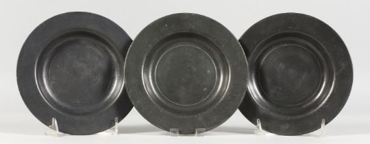THREE EARLY PEWTER CIRCULAR PLATES, stamped LONDON.