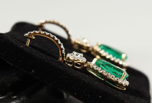A SUPERB PAIR OF 18CT WHITE GOLD, COLOMBIAN EMERALD AND DIAMOND DROP EARRINGS.