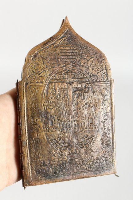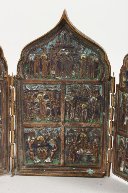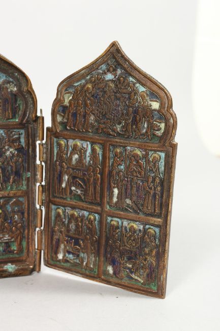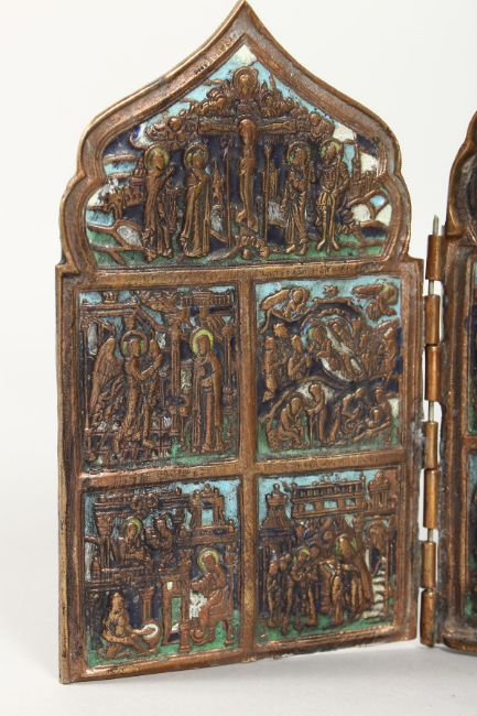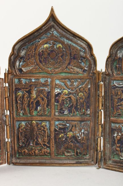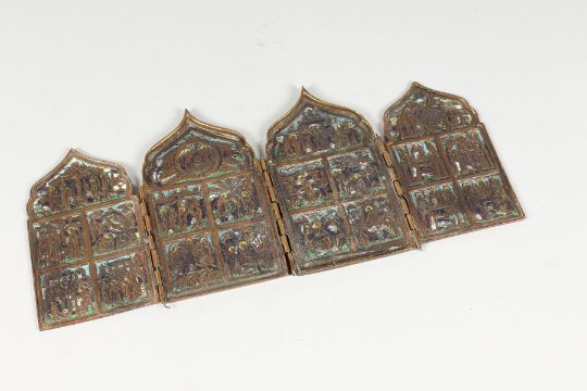 A LATE 19TH / EARLY 20TH CENTURY RUSSIAN BRONZE FOUR PANEL FOLDING TRAVELLING ICON with enamel decoration.