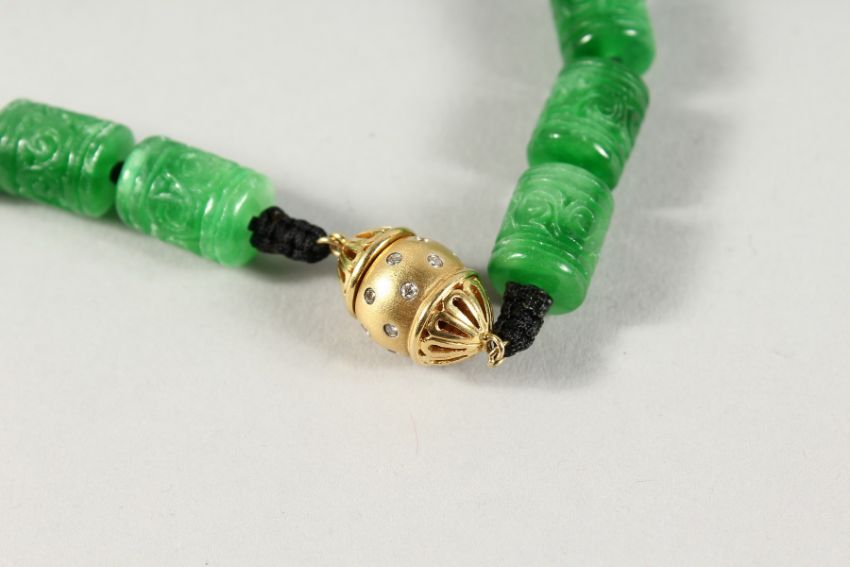 A SUPERB LONG STRING OF CAVED JADE BEADS with gold and diamond clasp.