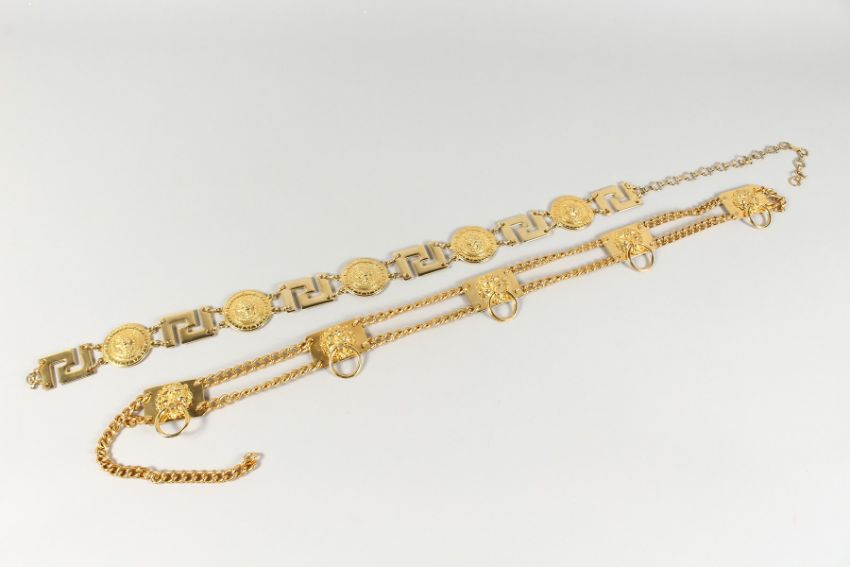 TWO GILT BELTS, both with five lion masks.