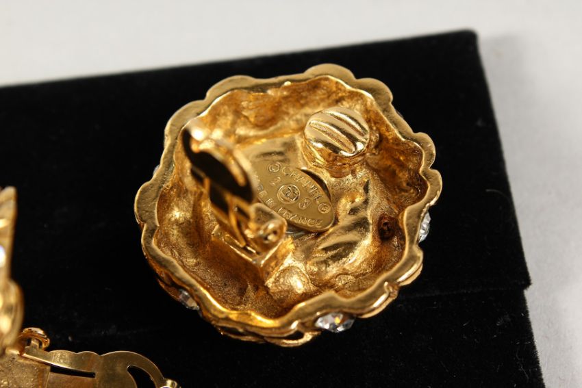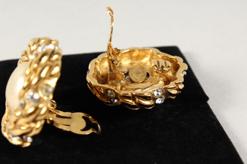 A GOOD PAIR OF CHANEL PEARL, GILT AND BRILLIANT EARRINGS, in a Chanel box.