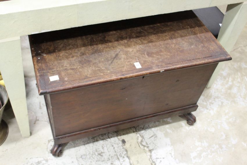 A mahogany trunk on carved feet.