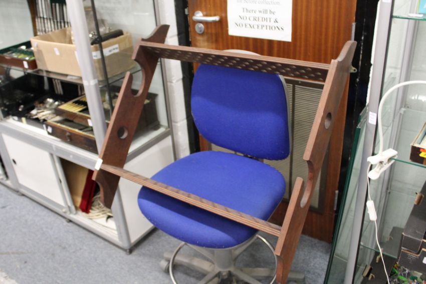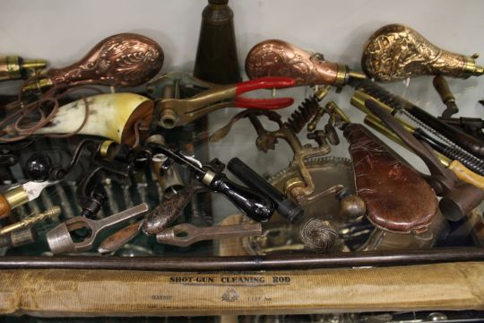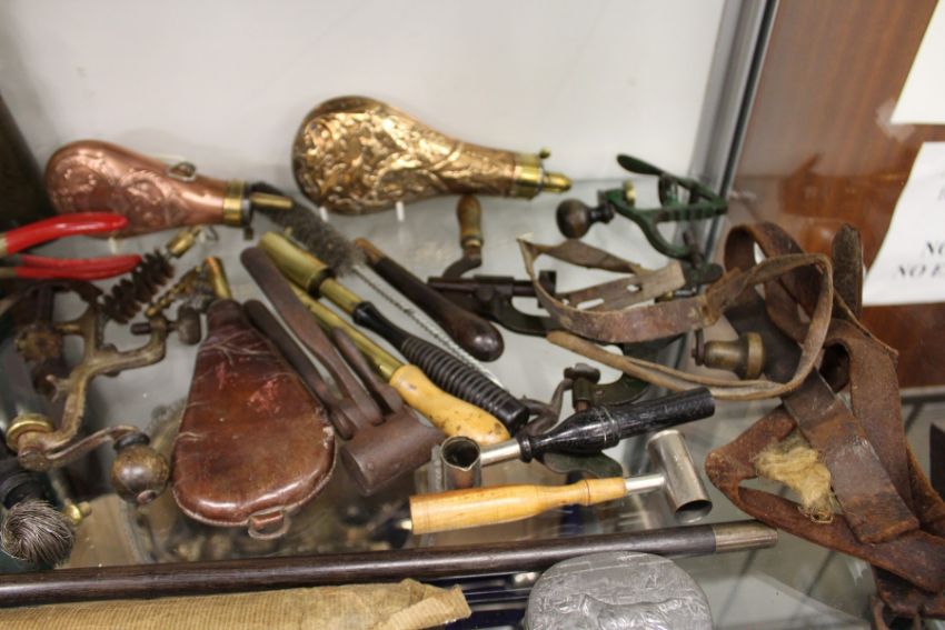 A good collection of shooting related items to include copper powder flasks, gun rack etc. etc.