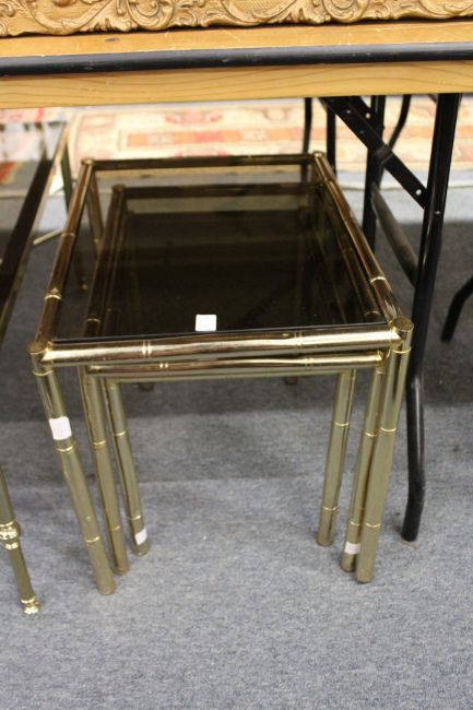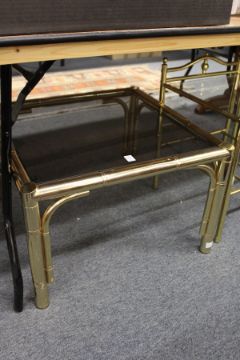 A brass faux bamboo and smoked glass coffee table together with a matching nest of tables.