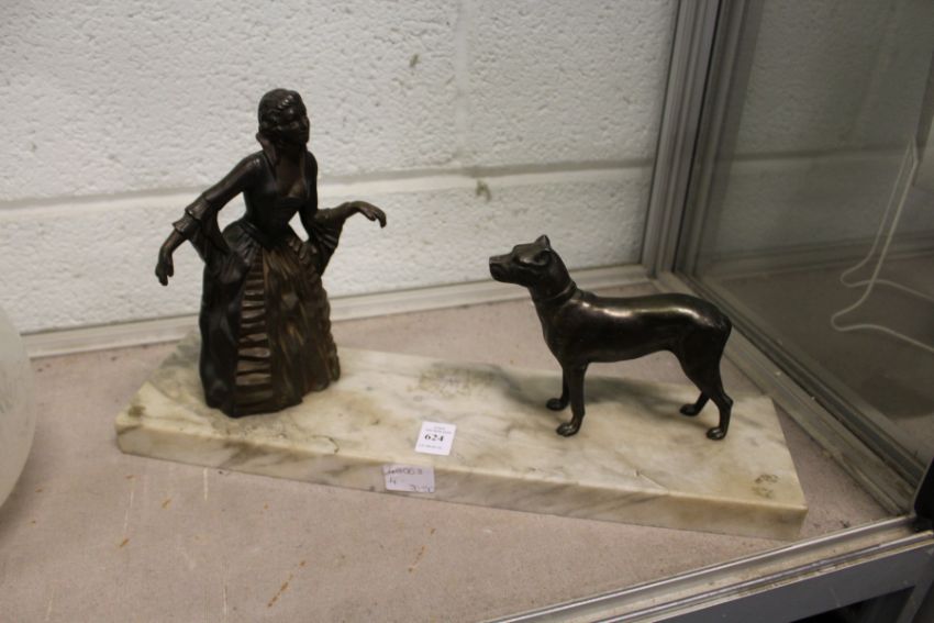 An Art Deco group of a young lady and a dog on a marble base.