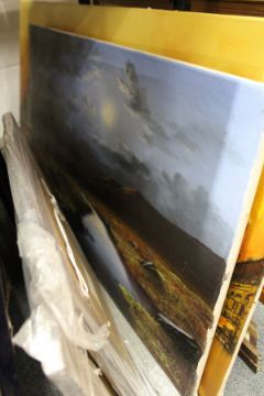 A pair of colour prints and two oil on canvasses depicting landscapes.