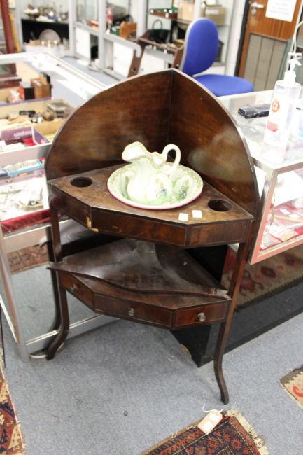 A mahogany corner wash stand complete with porcelain jug and bowl.