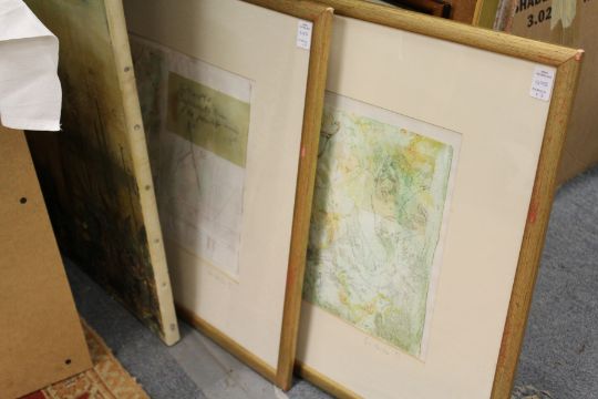 A landscape, oil on canvas, unframed together with a pair of prints.