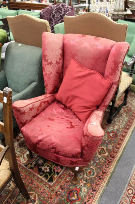 A George II style armchair upholstered in a classical crimson ground fabric on cabriole legs.