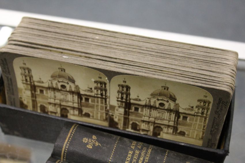 A Victorian stereoscopic viewer with a box of viewing cards.