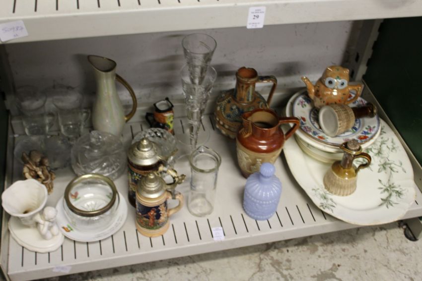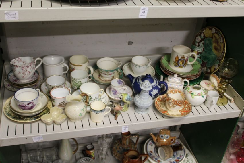 A quantity of decorative china and glassware to include Beswick birds, small Wedgwood Jasper ware teapot, cabbage leaf plates etc.