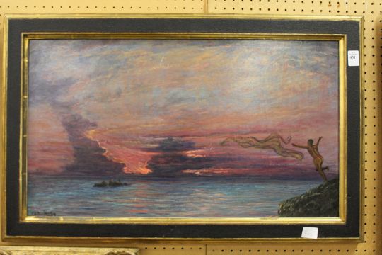 'The Last Throw' a study of a fisherman throwing a net into the sea oil on board, indistinctly signed.