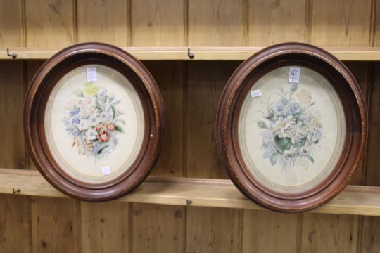A still life of flowers colour prints, a pair, framed as an oval.