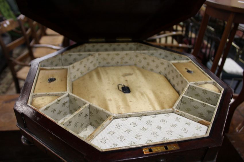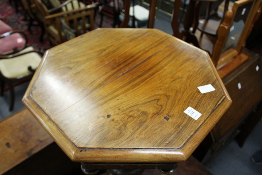 A 19th century rosewood octagonal shaped work table on carved tripod base.