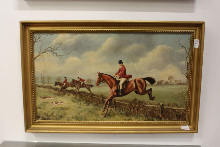 Michael Wood 'Hunting Scene with Figures on Horseback Jumping a fence' oil on canvas, signed.
