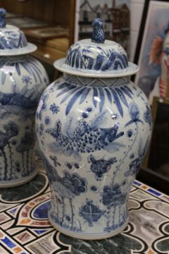 A large pair of Chinese blue and white temple jars and covers.