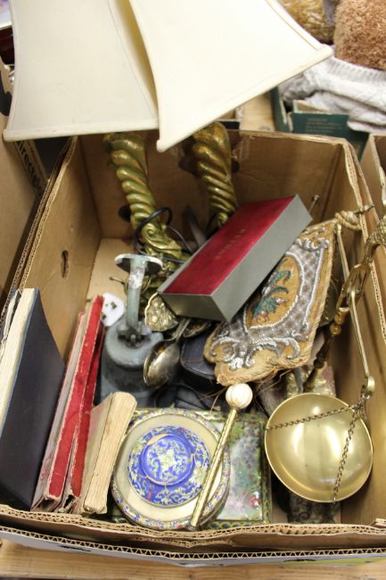 Miscellaneous collectables to include a stool, a pair of lamps, a wooden tray, scales etc.