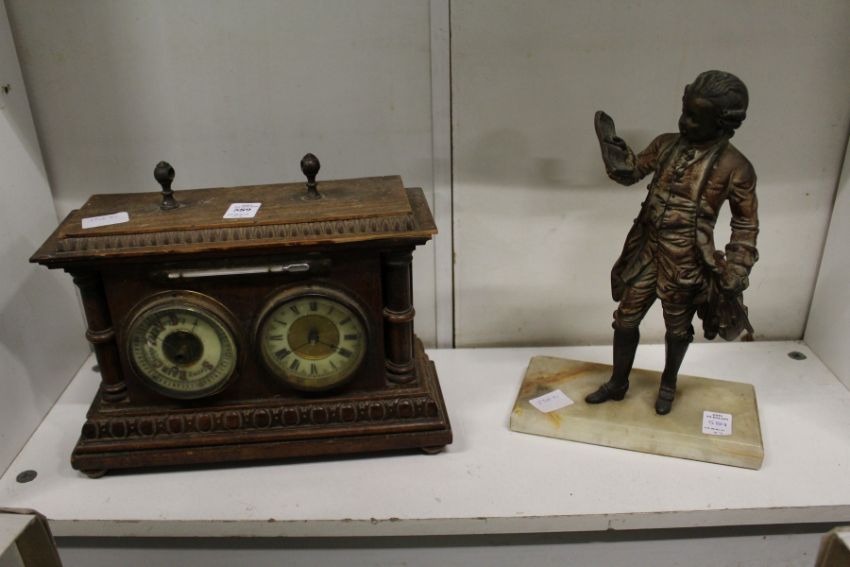 A combination clock, barometer and thermometer together with a cast metal figure of a musician.