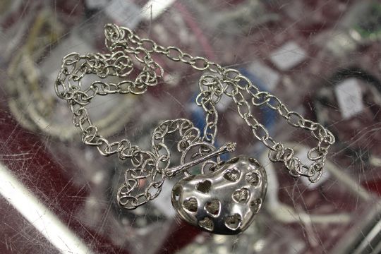 A necklace with pierced heart shaped pendant.