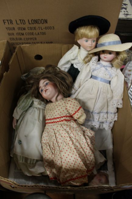 A late Victorian porcelain doll and other modern dolls.