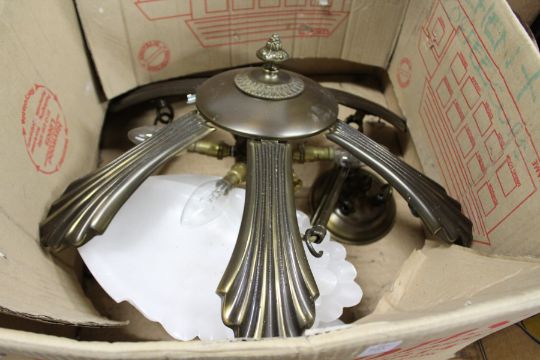 A decorative six light chandelier with alabaster shades.