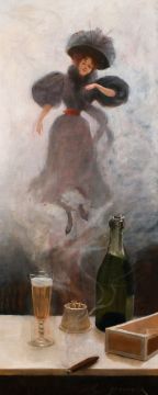 Pierre Bonnaud (B.1865), Scene of an elegant lady with champagne and cigars in the foreground, oil on canvas, signed, 39.5" x 16".