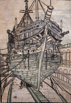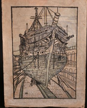 Hesketh Hubbard (1892-1957) British, " Bows of the Old Implacable" and "Stern of the Old Implacable", A pair of woodcuts depicting the building of the old implacable, woodcut, signed and inscribed, 17" x 12.5". (2)