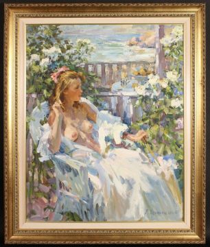 Viktor Yefimenko (b.1952) Russian, 'On The Veranda', signed oil on canvas 32" x 25.5", 81x65cm.
