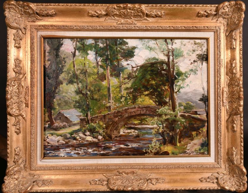 Robert Fowler (1853-1926) British, A woodland river landscape with a bridge and hills beyond, oil on canvas, signed, 16" x 22".