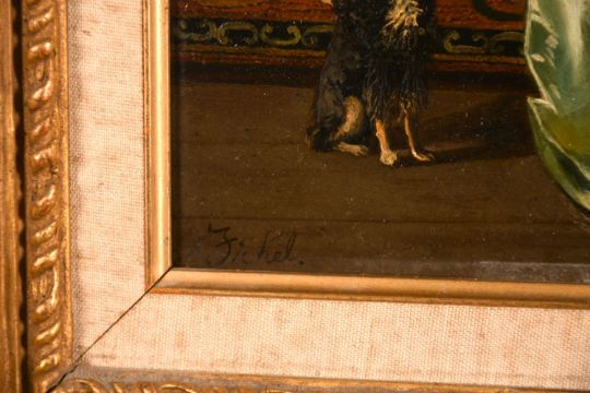 Benjamin Eugen Fichel (1826-1895) French, Ladies reading a letter in a formal room setting, oil on mahogany panel, signed, 15" x 12".