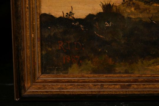 19th century school. Figures and a dog by a house on stilts, oil on canvas, initials R.J.D. dated '1887', 20" x 29.5".