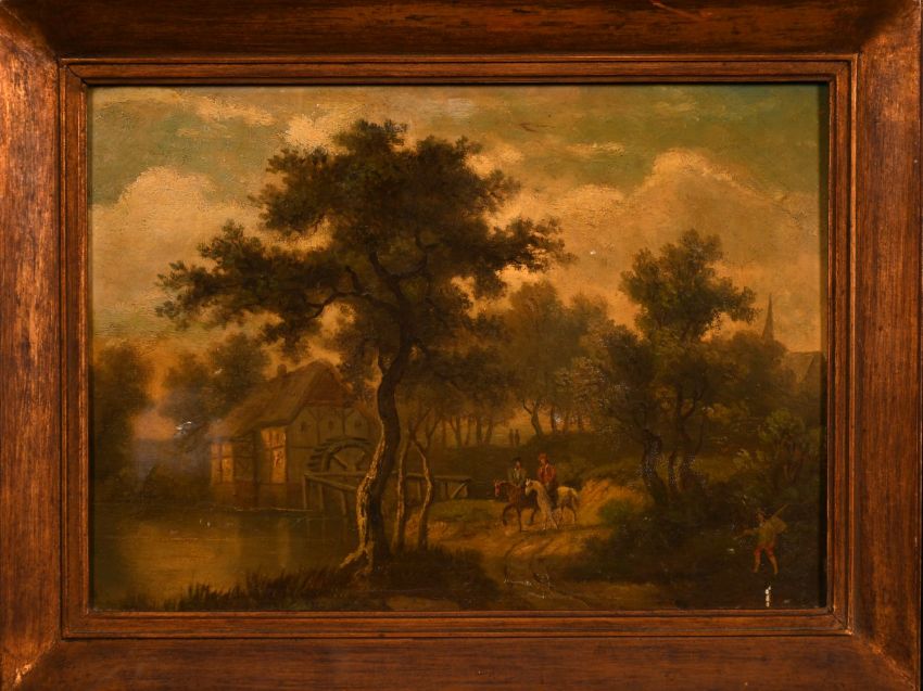 19th century school, possibly Dutch, a scene of figures on horseback by a watermill, oil on mahogany panel, 9.25" x 12.75".