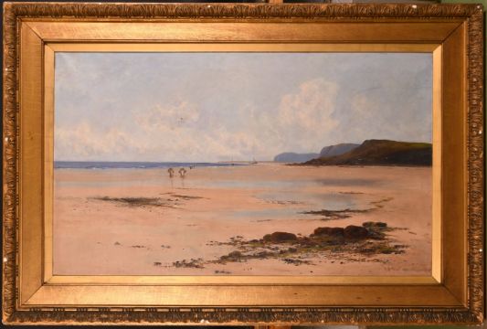 Joseph Vickers de Ville (1856-1925) British, figures on a sandy cove with fishing boats and rocky headland beyond, oil on canvas, signed and dated 1892, 30" x 50", in a Watts style frame.