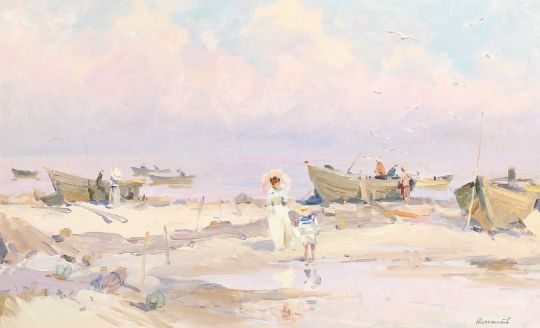 Alexei Novojilov (b.1937) Russian, 'At Low Tide', signed oil on board, 14" x 23", 36x58cm.