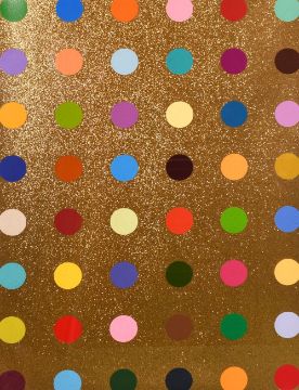 Damien Hirst, (B. 1965), untitled gold gift spot, framed screenprint in colours, gold glitter/ wove paper, signed in pencil 'For Franco Big It Up!', numbered 34/150, paper dimensions 38.5" x 30", Image dimensions 29.5" x 20".